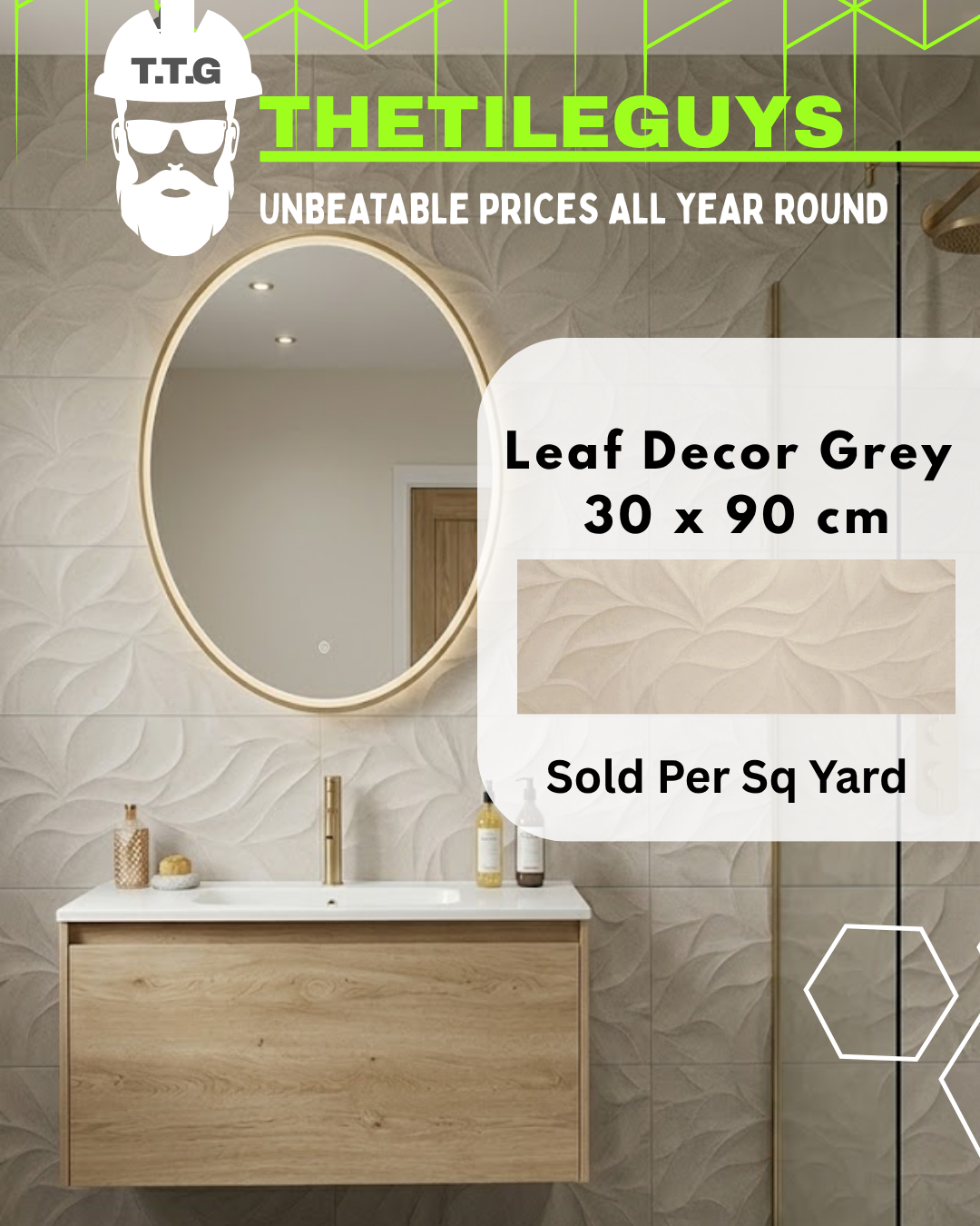 The 30x90cm format offers a sleek, modern finish with fewer grout lines, helping to create a more seamless and spacious appearance. Made from high-quality white body ceramic, Leaf Grey Decor is lightweight, durable, and easy to install, making it a practical and stylish choice for everyday interiors.