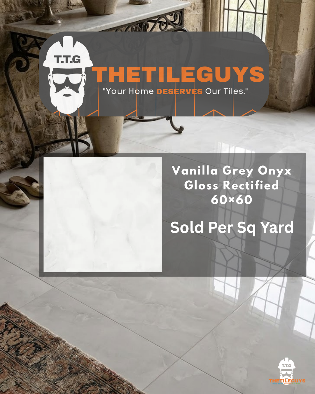 Upgrade your interiors with Vanilla Grey Onyx Gloss Rectified 60x60 – a premium porcelain tile that blends onyx-inspired beauty with modern practicality and timeless sophistication